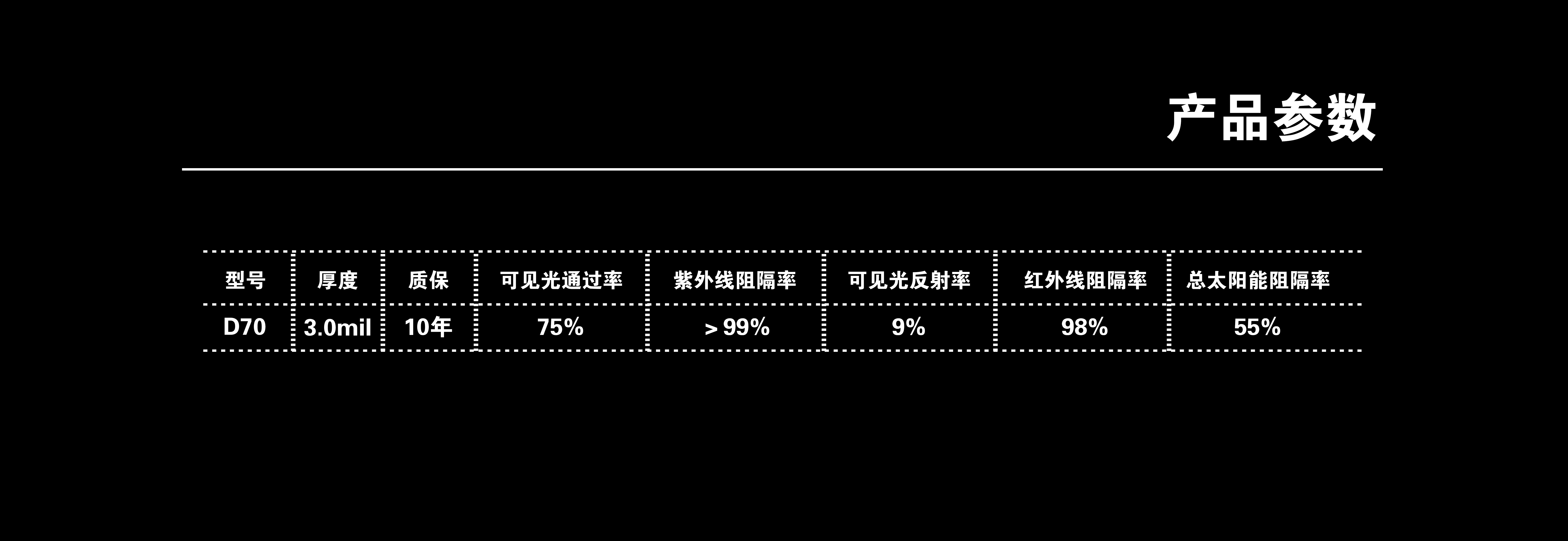 D系列窗膜有D70型号,独特的3mil厚度,具有很强的防爆安全性,并采用多层磁控贵金属光热阻隔技术,稀有金属智能配比,均衡汽车窗膜性能,可见光通过率75%,紫外线阻隔率> 99%,可见光反射率9%,红外线阻隔率98%,太阳能总阻隔率55% ,有效阻挡太阳热能,实现舒适凉爽驾乘环境,严选光学级PET基材,保障驾驶安全。
